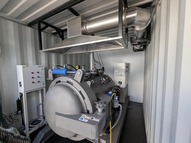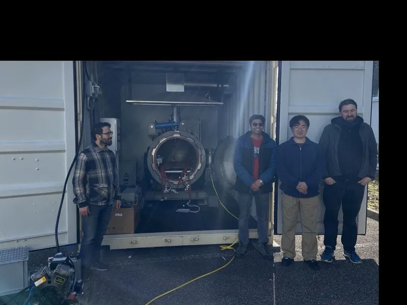 The new facility enables controlled abuse tests on lithium-ion batteries and small battery packs. The system consists of a 20-foot container with an integrated 500-liter pressure chamber (Diameter of 700 mm × 1.3m Depth) that serves as a defined test environment for experiments up to EUCAR Hazard Level 7. Various trigger methods such as nail penetration, overheating, short circuit, overcharging can be applied. Integrated sensors measure temperature, voltage, pressure, and gas composition, enabling detailed analysis of hazardous emissions during battery fires. An integrated flue gas scrubbing system ensures that combustion gases are treated to minimize environmental impact.