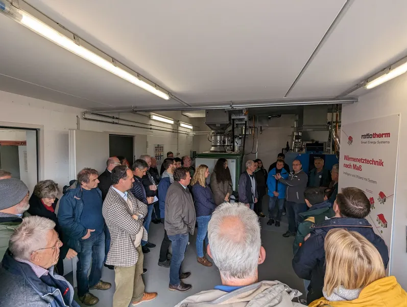 Mr Marco Burkard, who is responsible for heating technology at municipal utility of Hassfurt, explains the technology used for the district heating network with a variable temperature at the nearby heating centre. The flow temperature of just 40 degrees Celsius is sufficient for the surface heating of the new development area. Small heat pumps are installed in the customers' homes to heat domestic hot water.