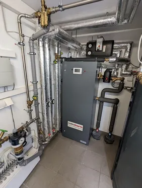 The transfer station and heat pump of an apartment block connected to the district heating system. The municipal utility is responsible for maintaining the decentralised technology. The customer only pays a fixed heat price for 10 years.