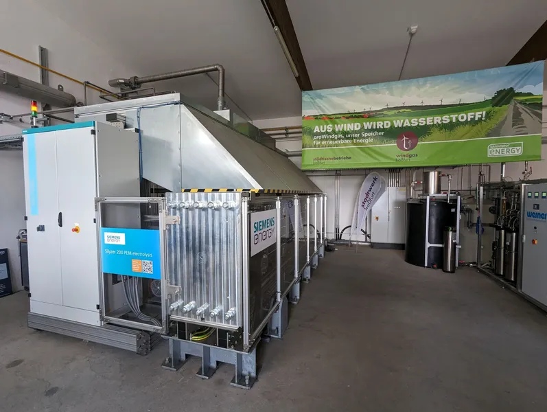 The 1.25 MW electrolyser including water treatment, which converts surplus wind power into hydrogen. This is either fed into the municipal utility's own gas network or converted directly into electricity via a CHP unit.