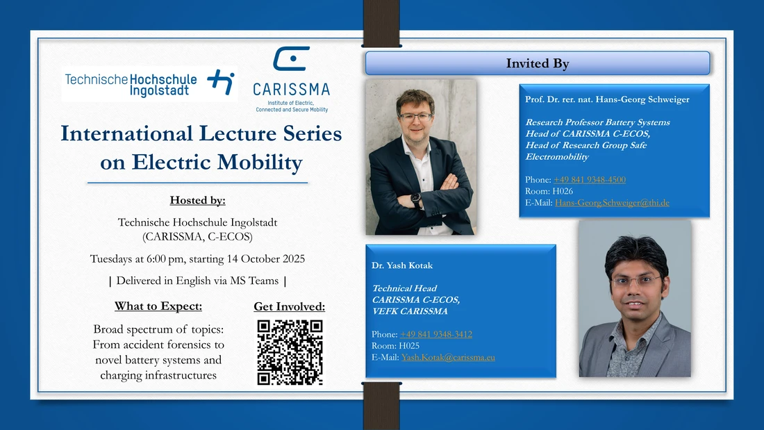 Die Technische Hochschule Ingolstadt freut sich, auch in diesem Wintersemester die Internationale Ringvorlesung zur Elektromobilität anzubieten – bereits zum neunten Mal in Folge. In diesem Jahr steht die Vortragsreihe ganz im Zeichen der Projekte, Forschungsfelder und Kompetenzen der THI. Damit möchten wir zeigen, wie breit wir in Ingolstadt aufgestellt sind und welche Beiträge wir zur Mobilität der Zukunft leisten.