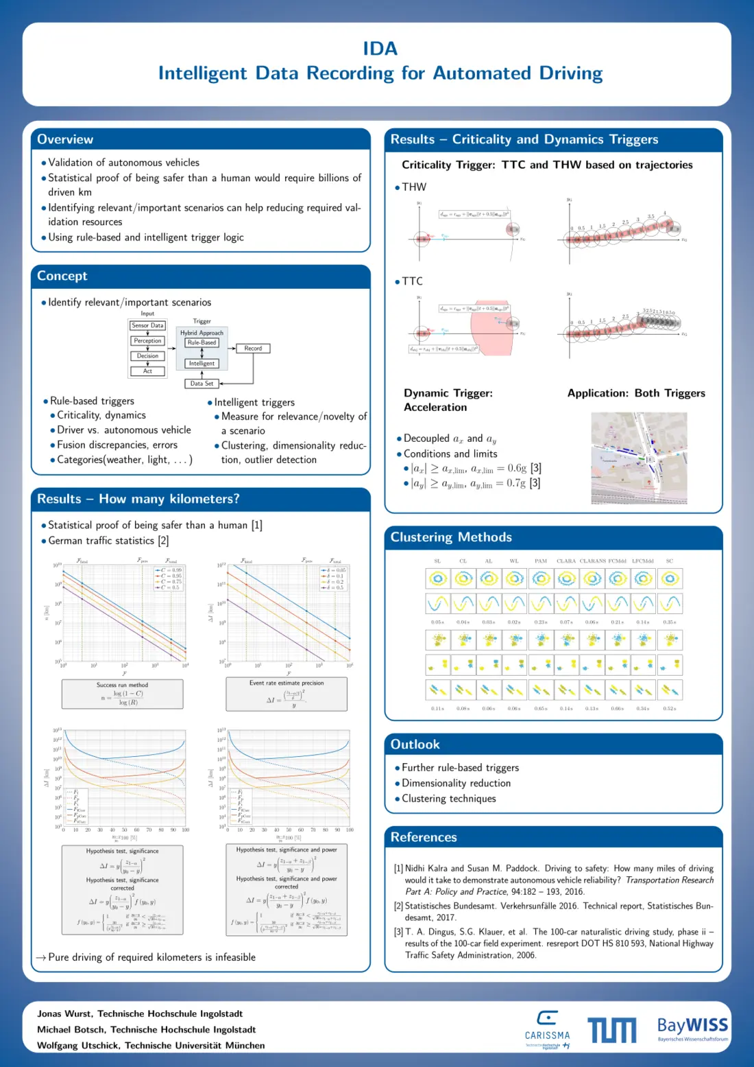 Das Validieren autonomer Fahrzeuge stellt eine Schlüsseldisziplin der aktuellen Automobilforschung dar. Neben dem sich daraus ergebenden Vertrauen der Öffentlichkeit und der Kunden, stellt diese auch eine rechtliche Relevanz dar. Eine statistisch signifikante Demonstration, dass ein autonomes Fahrzeug 20% weniger Verkehrstote verursacht als der durchschnittliche deutsche Fahrer, würde mehr als 10 Milliarden gefahrene Kilometer voraussetzen (Abb. 1). Das Einfahren einer solchen Strecke ist wirtschaftlich nur schwer realisierbar. Hier wird häufig auf szenarienbasierte Ansätze zurückgegriffen. Dazu werden lediglich repräsentative Szenarien getestet. Das Identifizieren von repräsentativen, relevanten und wichtigen Szenarien leistet einen Beitrag zur Reduzierung des Testaufwands. Zusätzlich reduziert eine solche Erkennung den erforderlichen Speicherbedarf für aufgenommene Daten massiv. Das Ziel dieses Projekts ist es, mittels regelbasierter Methoden und maschineller Lernverfahren, neue und relevante Szenarien zu identifizieren.