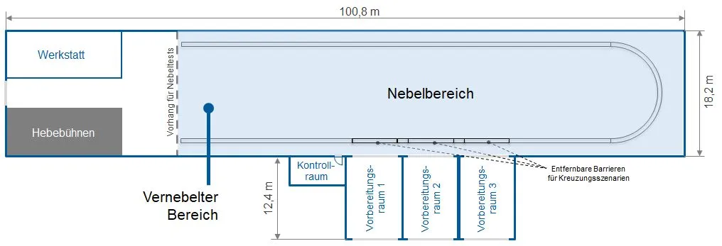 Auf einer vernebelten Fläche von ca. 780 m² (65 x 12 m) können neben statischen Tests auch dynamische Sensor- und Fahrversuche durchgeführt werden. Die Länge der Nebelfläche von 65 Metern ermöglicht die Erforschung der Auswirkungen auf die Fahrzeugumfeldsensorik auch über größere Distanzen. Da sich der stehende Nebel auch unter der Regenanlage bildet, sind auch Kombinationen aus Regen und Nebel möglich.