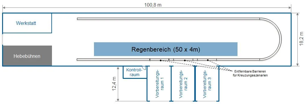 Mit Hilfe der Regenanlage in der Indoor-Versuchshalle können realitätsnahe Regenszenarien simuliert werden. Die Reproduzierbarkeit der Witterungsverhältnisse steht im Mittelpunkt des Aufbaus. Auf der gleichmäßig beregneten Fläche von ca. 200 m2 können neben statischen Versuchen auch dynamische Sensor- und Fahrversuche realisiert werden. Die Länge der Regenfläche von 50 m ermöglicht die Erforschung der Auswirkungen auf die Umfeldsensorik auch über größere Distanzen.
