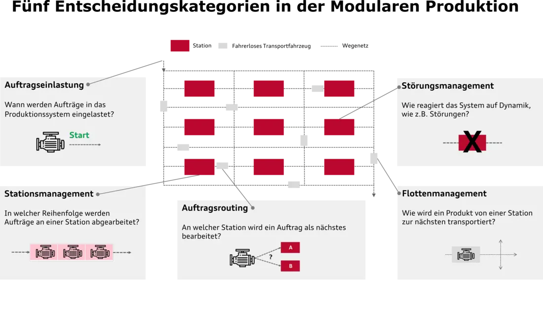 Heute werden Motoren üblicherweise in Fließfertigung montiert. Alternativ kann zum Umgang mit der Variantenvielfalt zukünftiger Antriebe wie beispielsweise E-Maschinen ein flexibleres modulares Fertigungskonzept verfolgt werden. In diesem führen fahrerlose Transportfahrzeuge die Materialtransporte zwischen entkoppelten modularen Stationen durch. Die Verkettung entfällt. Eine derartige modulare Produktion bietet mehr Flexibilität, beispielsweise kann ein Fertigungsauftrag verschiedene Routen durch das System wählen, um gestörten Maschinen ausweichen zu können. Um diese Flexibilität zu nutzen, muss die Produktionssteuerung entsprechende Entscheidungsstrategien bieten. Die wesentlichen Entscheidungsbereiche sind in der Abbildung dargestellt. Das Promotionsprojekt befasst sich mit Steuerungsalgorithmen, die diese Entscheidungen in einer modularen Produktion treffen und untersucht ihre Eigenschaften in Abhängigkeit von der Dynamik (z. B. Maschinenstörungen) und der Komplexität (z. B. Anzahl Produkttypen) des Produktionssystems. Das Ziel ist ein optimaler Produktionsablauf hinsichtlich der Stations- und Transportfahrzeugauslastungen, der Durchlaufzeiten der Fertigungsaufträge und des Durchsatzes des Produktionssystems.