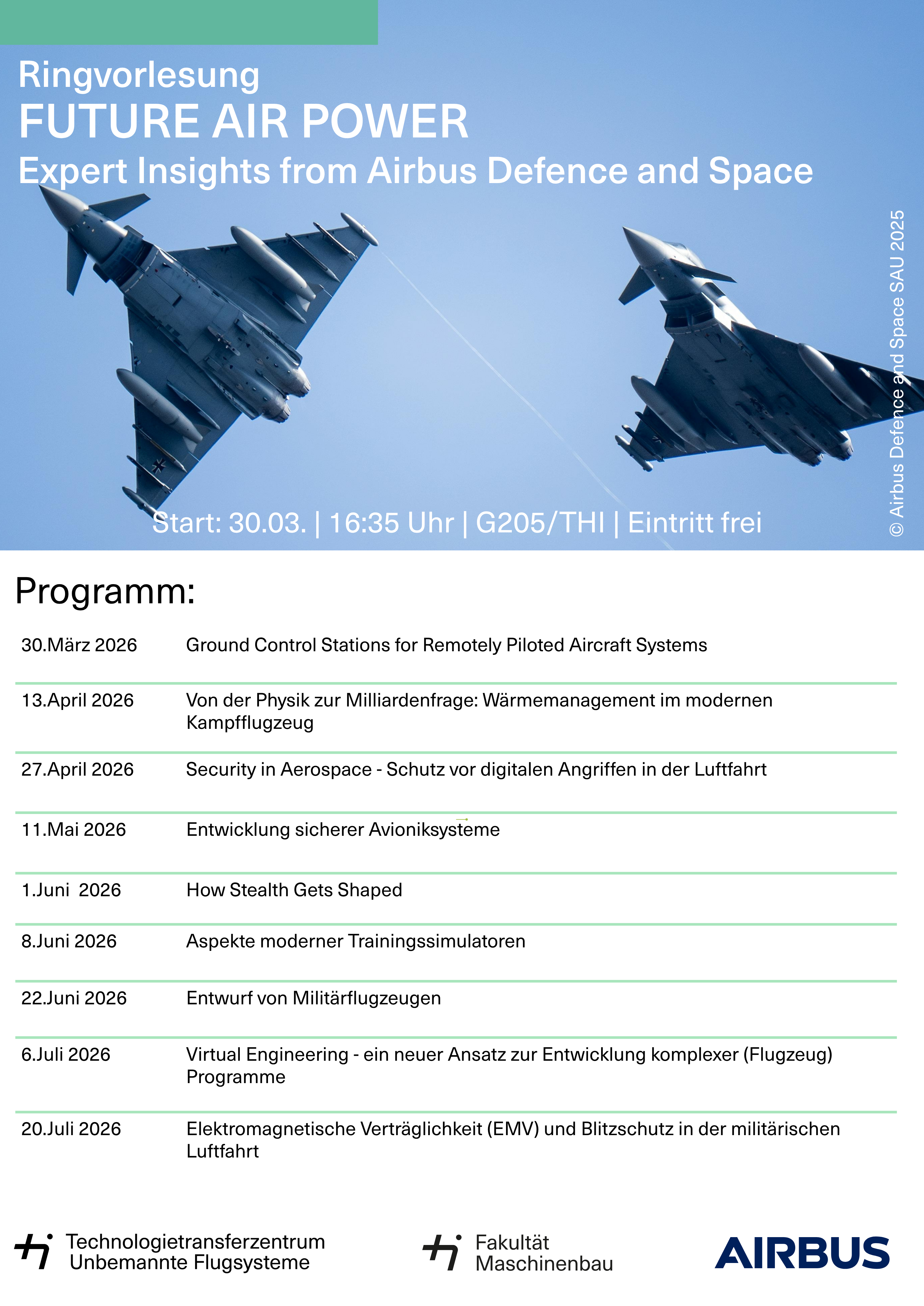 Die Ringvorlesung „Future Air Power“ bietet Studierenden sowie allen Interessierten die Möglichkeit, tief in zentrale Themen der modernen Luft- und Raumfahrt einzutauchen. In einer Reihe spannender Vorträge geben Fachleute aus der Industrie praxisnahe Einblicke in aktuelle Technologien, Entwicklungsprozesse und zukünftige Herausforderungen.