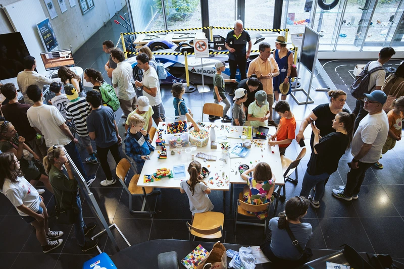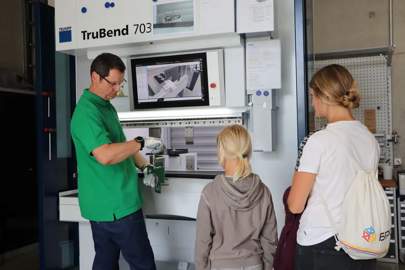 Neben den zahlreichen Aktionen und Attraktionen für Kinder und Erwachsene konnte man die verschiedenen Forschungsbereiche der THI bei Führungen und Experimenten hautnah erleben. Im Labor zeigte Professor Klaus-Uwe Moll, Dekan der Fakultät Maschinenbau, beispielsweise, wie man mit der Abkantpresse „TouBend7036“ Zettelboxen herstellt. „Die Studierenden lernen hier, mit Blech kostengünstig und nachhaltig zu konstruieren“, erklärte Moll. Vor dem Labor drängten sich Kinder fasziniert um eine Miniaturstadt, in der ein TurtleBot des Instituts AImotion Bavaria seine Runden drehte. Mit dem kleinen Roboter, der sich selbstständig in seiner Umgebung orientiert und verschiedene Fahraufgaben meistert, wird das automatisierte Fahren erforscht.