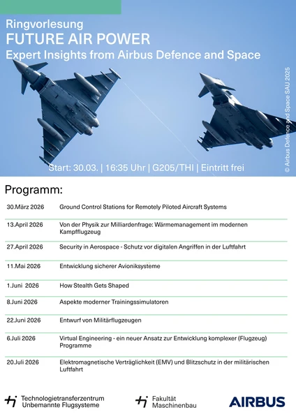 Erhalte exklusive Einblicke in die Welt moderner Luftfahrtsysteme – von unbemannten Flugsystemen über Avionik und Simulation bis hin zu Stealth Technologien und Sicherheit in der Luftfahrt. Experten und Expertinnen von Airbus Defence and Space präsentieren aktuelle Entwicklungen, reale Anwendungen und technologische Herausforderungen aus der Praxis.