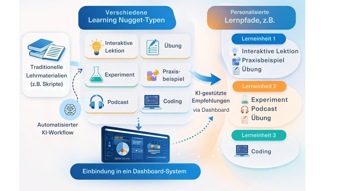 Im Projekt entsteht ein Workflow, mit dem bestehende Lehrmaterialien (z. B. Skripte und Foliensätze) KI-gestützt in kompakte, interaktive Microlearning-Einheiten („Learning Nuggets“) überführt werden, um zeit- und ortsunabhängiges Lernen gezielt zu unterstützen. Außerdem knüpft AI@ProSuccess an die KI-Kompetenz der THI sowie an das Projekt THISuccessAI an: Dort wurde ein Dashboard-System inklusive KI-gestützter, lernstandsbasierter Empfehlungen entwickelt. AI@ProSuccess überträgt und erweitert diesen Ansatz für die spezifischen Anforderungen berufsbegleitender Studiengänge. Die entwickelten Learning Nuggets werden in das Dashboard integriert, um individuelle Lernpfade entlang von Vorkenntnissen und beruflichen Rahmenbedingungen zu unterstützen und den Lernfortschritt sichtbar zu machen.